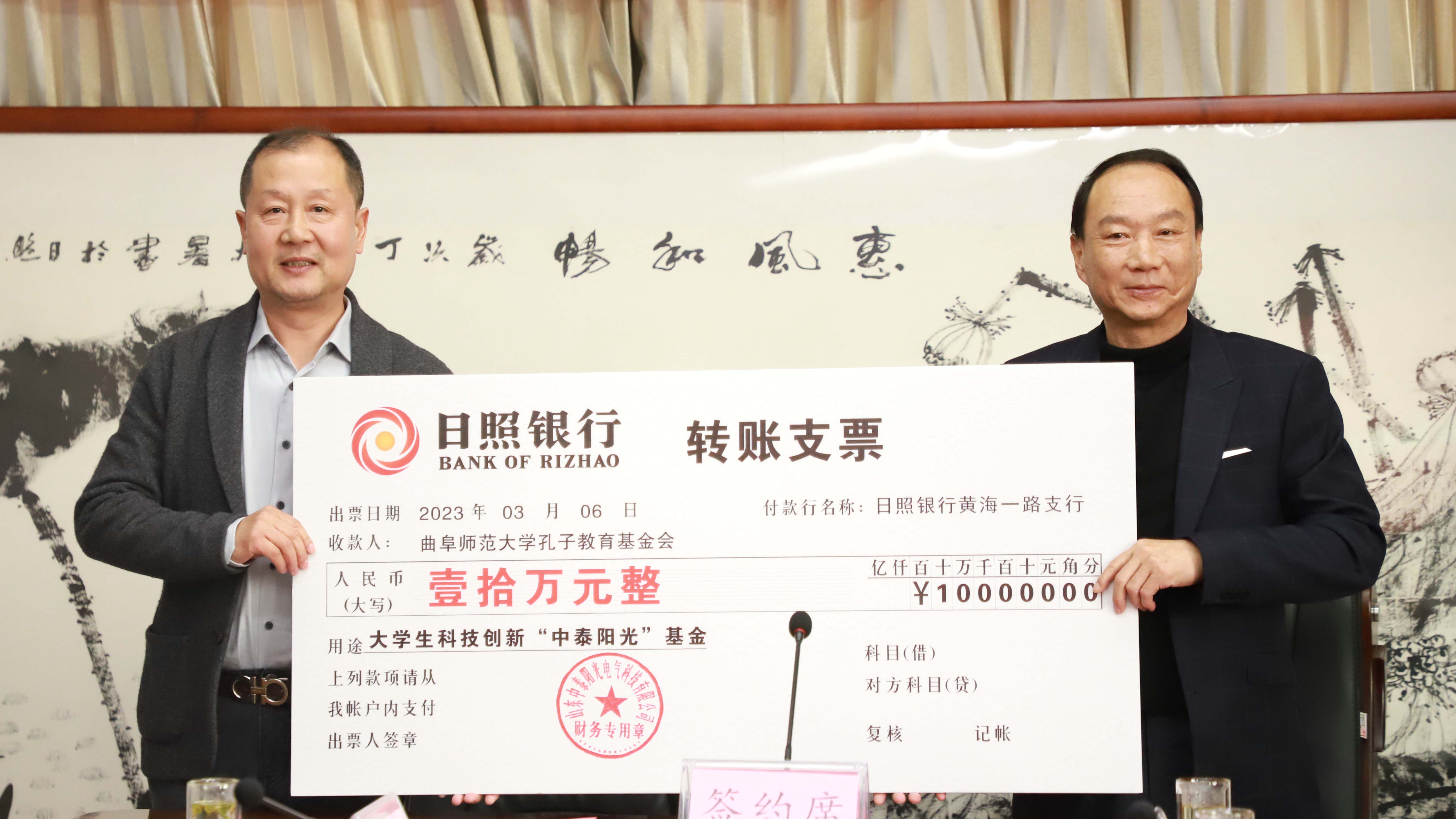 2023年3月6日上午,曲阜師范大學(xué)大學(xué)生科技創(chuàng)新“中泰陽光”基金捐贈(zèng)儀式順利舉行。儀式由經(jīng)開區(qū)黨群工作部部長王法杰主持,曲阜師范大學(xué)黨委書記邢光、市政協(xié)副主席孟凡香、集團(tuán)董事長牟建出席并講話。參加此次會(huì)議的還有曲阜師范大學(xué)、市政協(xié)、經(jīng)開區(qū)及中泰陽光集團(tuán)有關(guān)負(fù)責(zé)同志。儀式上,公司順利將大學(xué)生科技創(chuàng)新“中泰陽光”基金捐贈(zèng)予曲阜師范大學(xué)孔子基金會(huì),并承諾為高校搭建企業(yè)科研創(chuàng)新基地和教學(xué)實(shí)踐基地。曲阜師范大學(xué)也表示,配合做好基金的監(jiān)管與發(fā)放,確保所有資金全部用于學(xué)生科技創(chuàng)新成果獎(jiǎng)勵(lì)。儀式上,校企雙方達(dá)成共識,將以此次活動(dòng)為契機(jī),繼續(xù)加強(qiáng)溝通、深化合作、優(yōu)勢互補(bǔ)、共同發(fā)展,努力構(gòu)建合作發(fā)展的新平臺(tái)。